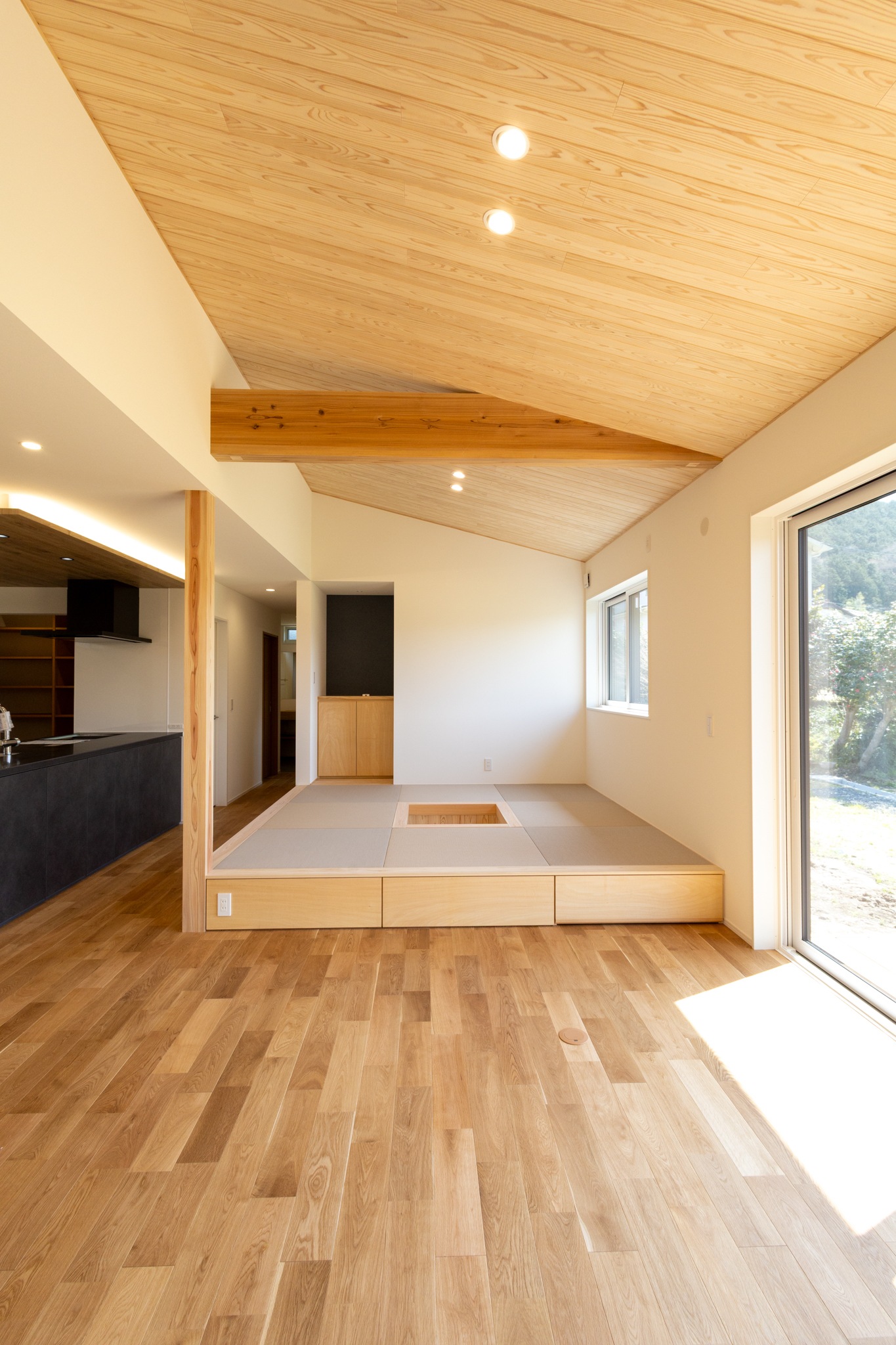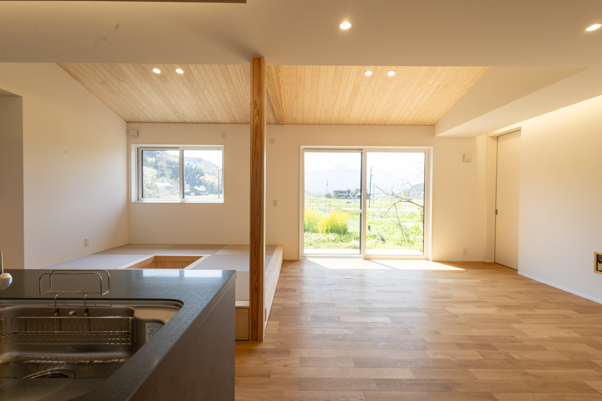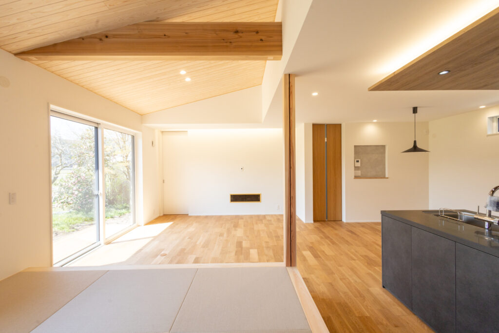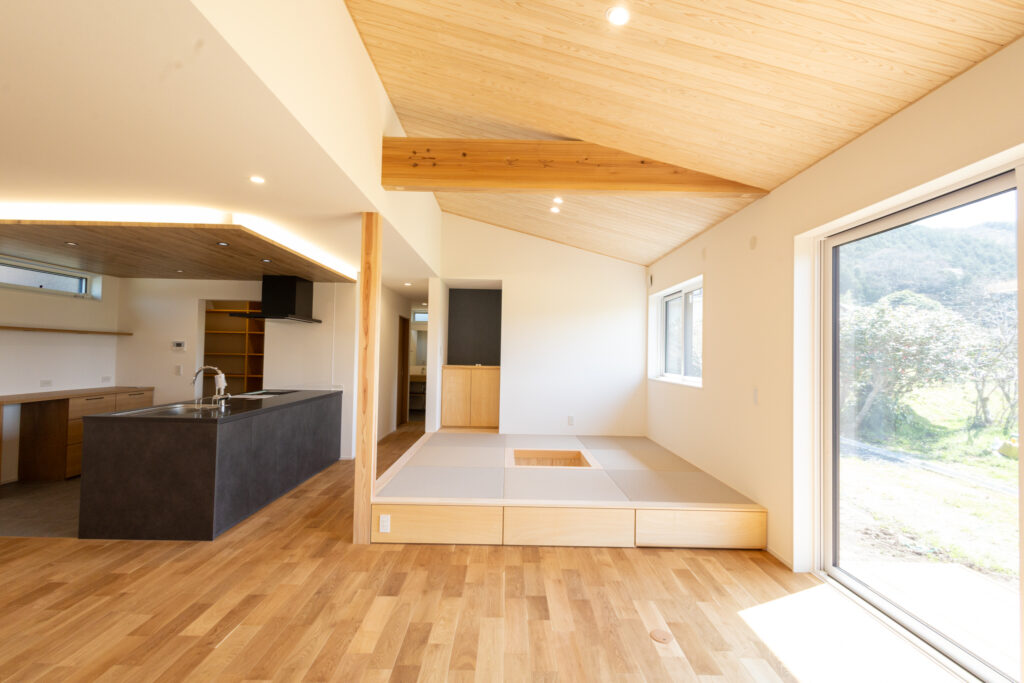 開放的なリビング空間と緩やかにつながる小上がりの畳。