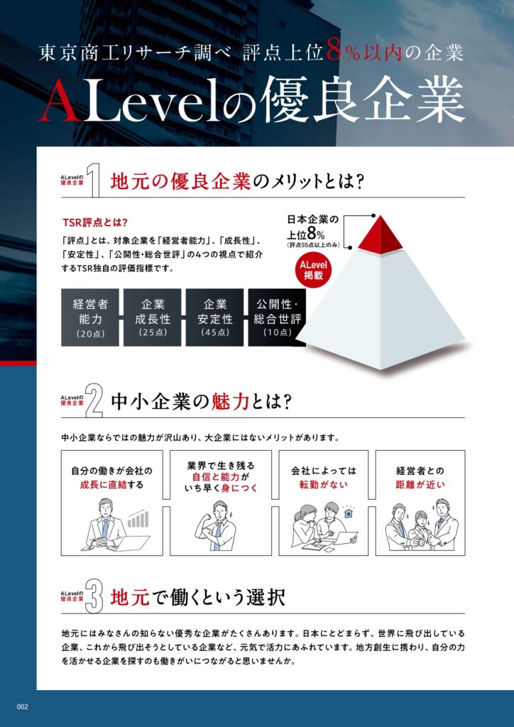 「A Level」は、東京商工リサーチの企業信用調査において、厳格な基準を満たした企業のみが掲載される情報誌です。日頃からの皆様のあたたかいご支援に心より感謝申し上げます。
